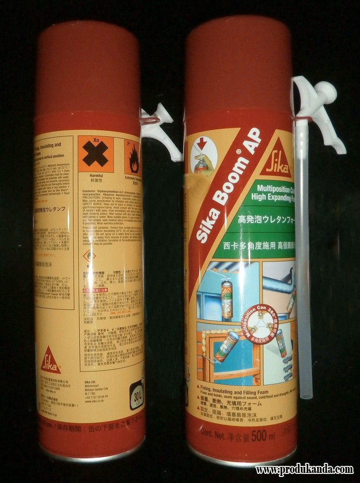 adalah cairan busa/foam polyurethane yang dapat mengembang dan cepat kering. Kegunaan • Bahan cairan pengisi celah dan lubang, setelah 25 menit akan mengembang. • Bahan kedap suara, mencegah masuknya debu, pengisi celah dan menutup aliran udara. • Bahan pengisi pada bingkai/ kusen jendela dan pintu. • Bahan insulasi pipa AC, pipa air dan sebagainya. • Bahan pengisi celah kedap air dan sebagainya. Karakteristik dan Kelebihan • Bahan Foam setelah mengembang memiliki ketahanan terhadap cairan minyak atau thinner. • Cairan Foam yang disemprotkan (spray) ke dalam suatu celah dapat bergerak dan mengisi celah yang kosong dan sempit serta akan mengembang setelah +/- 10 menit pada suhu +5 s/d 35 derajat Celsius • Sealant Foam setelah disemprotkan akan mengembang dengan ukuran +/- 5 x dari ukuran awal dan bentuknya dapat mengikuti bidang permukaan yang ada atau diinginkan dan pengeringan setelah 30 menit. • Dapat dipotong, diampelas dan dicat sesudahnya. • Dapat digunakan dalam posisi terbalik. • Cocok untuk penggunaan diluar ruangan. • Mempunyai daya rekat yang sangat baik di semua permukaan. • Aplikasi cepat dan mudah. • Menjangkau area/ lubang yang sulit untuk ditutup / diisi. Warna Kuning muda Kemasan Kaleng: 500 ml x 12 pcs per box. ___________________________________________________________________________________________________ Sika Boom-AP - Expanding foam Description: Sika Boom-AP is a fast curing expanding foam. It can be used as a fixing and insulating foam. Uses: Filling gaps and voids. Blocking out dust, noise and draft. Installation of window and doorframes. Insulation of pipes. Advantages: Can be used when held upside down. Suitable for use outside. Can be cut, sanded and painted. Has excellent adhesion to most substrates. Quick and easy gap filler. Reaches difficult access areas that need to be filled. Storage and Shelf Life: This product when stored at temperatures of between 18C and 22C will have a shelf life of twelve (12) months. Instructions for Use Surface Preparation: All surfaces must be free of dust, grease, oil and surface contaminates. The surface should be pre-moistened with water before application. To ensure that the foam cures at an optimum rate, and secondary foam expansion is prevented. Application: Screw the nozzle onto the can. Shake can thoroughly (approximately 20 times) before use. Apply foam by pointing nozzle into area to be filled and depress. It can be applied valve up or down. Foam will dispense rapidly and will expand 1.5 to 2 times its size as it comes out of the can. The quantity of foam can be regulated by varying the pressure of the adapter. Cleaning: Remove fresh spots of foam immediately using cleaner such as acetone. Cured foam can only be removed mechanically. |